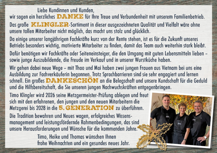 Wir sagen Danke für Ihre Treue – und blicken voller Energie nach vorn. Unser Familienbetrieb wächst weiter, setzt auf frische Talente und vereint Erfahrung, Leidenschaft und Mut zu neuen Wegen.