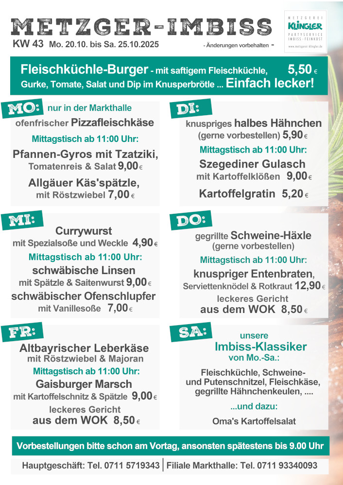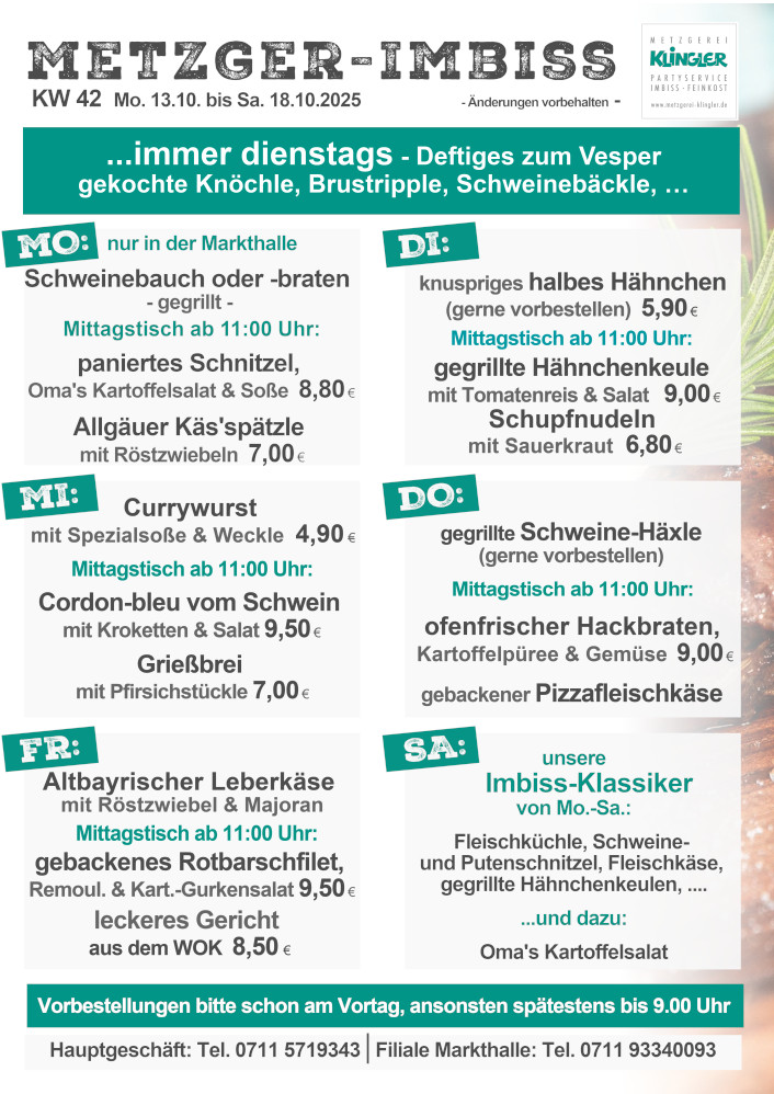 Wer sich etwas Gutes gönnen möchte, kann sich bei Klingler’s heißer Theke ein schmackhaftes und gesundes Tagesessen auswählen. Die täglich wechselnden Leckereien werden vom Küchenteam frisch zubereitet. Bestellungen bitte vortags, für den heutigen Tag sollten Sie bitte bis spätestens 9.00 Uhr bestellen.